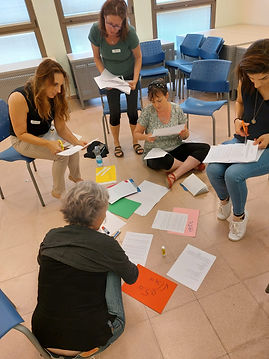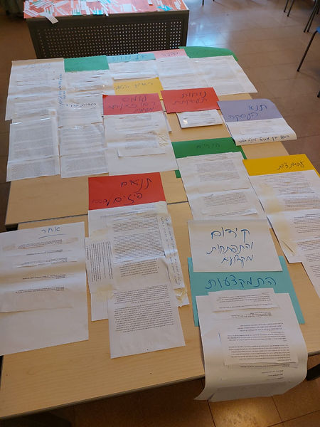כולנו, משתתפות ומנחות כאחת, חשנו שהעבודה על המטלות והחיבור שלהן לתמות משותפות היא מורכבת. חלקנו הבנו מיד את העניין והתחלנו במרץ לגזור. לעיתים נתקענו סביב משפטים ספציפיים שלא תמיד התחברו. כל קבוצה מצאה לה שיטה ייחודית לאיסוף וארגון התוצרים. "זה היה מרתק" ציינו אחדות מאיתנו. מה מרתק? האיסוף, השיתוף, העיבוד המשותף והעדות כיצד נאספים כל הקולות אישיים, לגוף רחב ומקיף יותר של יידע.